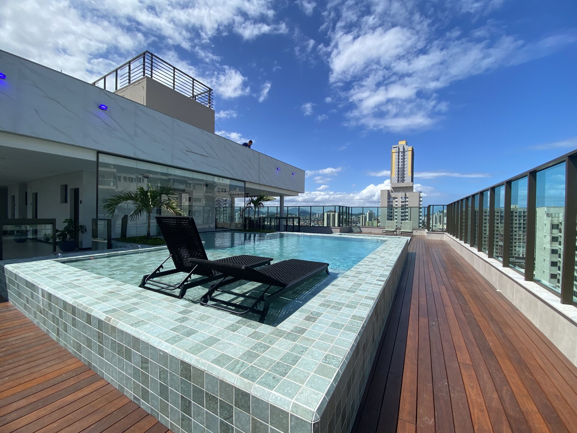 Maravilhosa área de lazer na cobertura composta por piscinas adulto e infantil, sala fitness, churrasqueira, salão de festa, espaço gourmet, playground, solarium e praça. O condomínio foi projetado ainda com sistema de aproveitamento da água da chuva para uso nas áreas comuns, aproveitamento da água gerada pelos aparelhos de ar condicionado dos apartamentos para uso do condomínio, sistema de captação de energia solar e bike sharing.