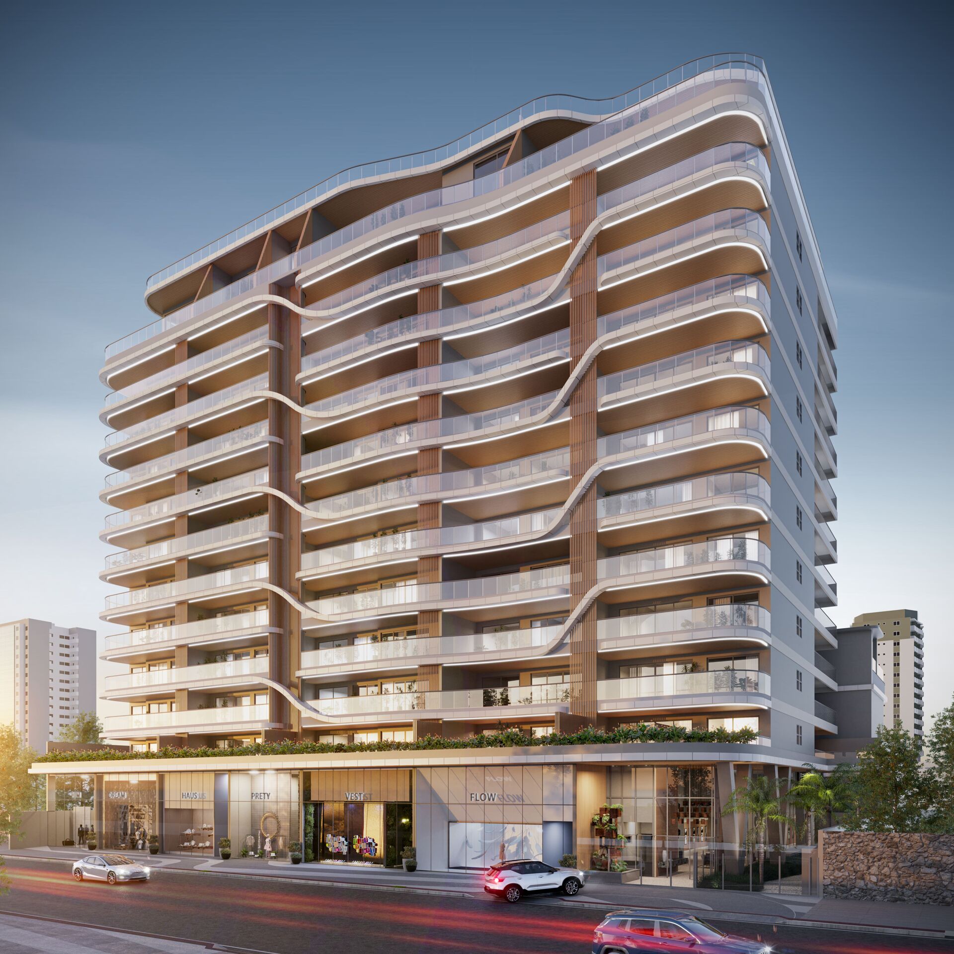 As três torres conjugadas - Musa, Bella e Donna - possuem uma ou duas unidades por andar nas modalidades tipo Garden e Cobertura linear com pé-direito duplo e rooftop.